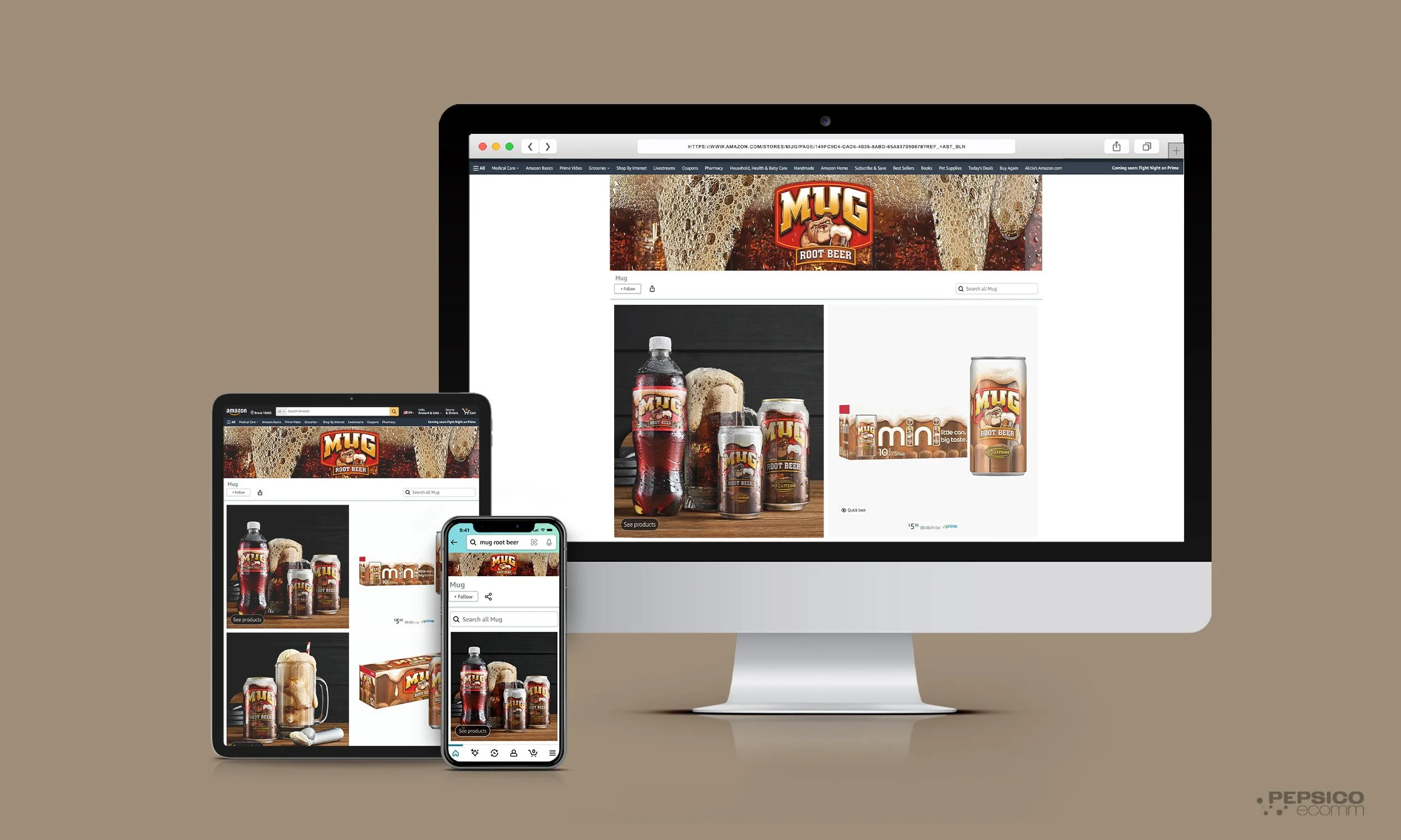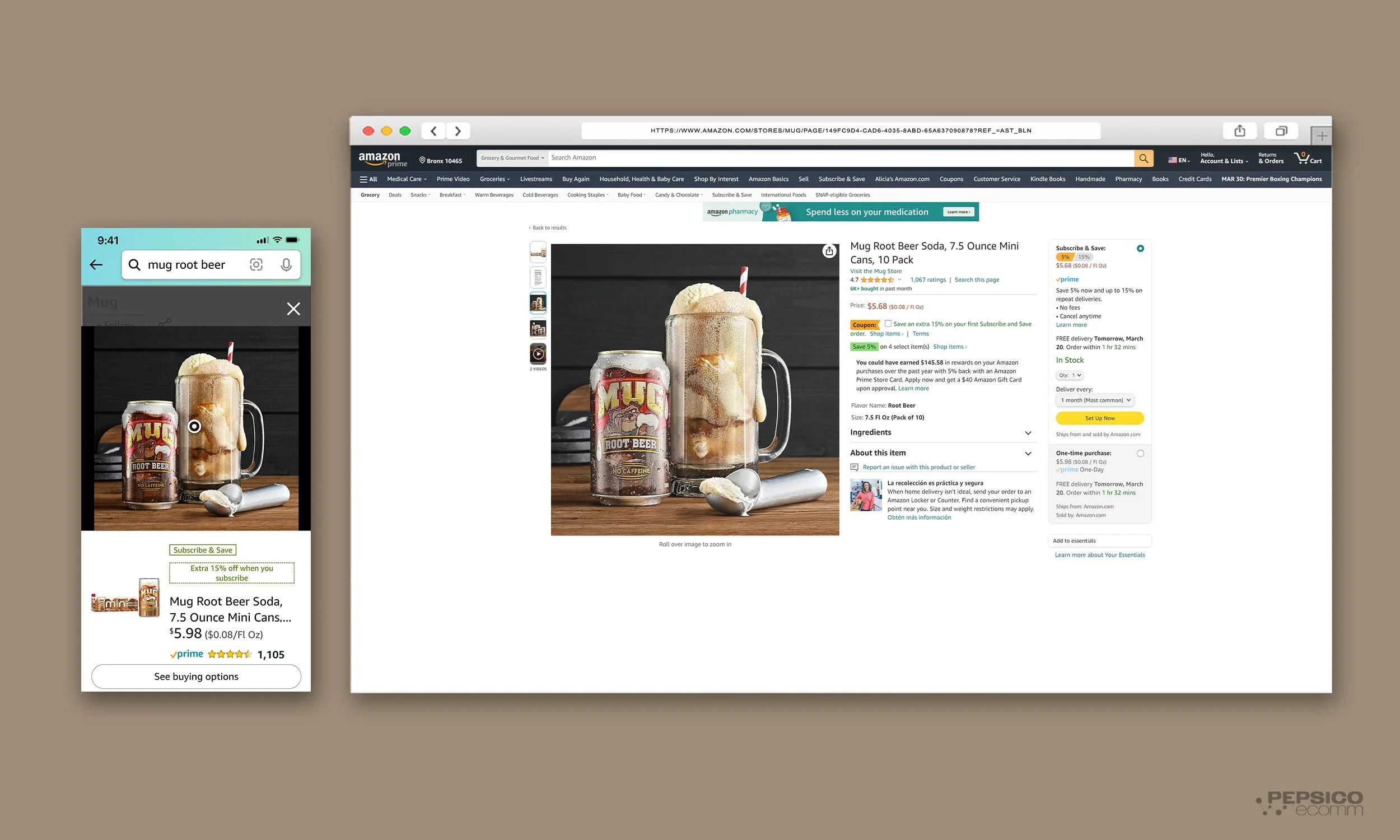 Featuring Amazon’s web page with Mug Root Beer on a mobile device.